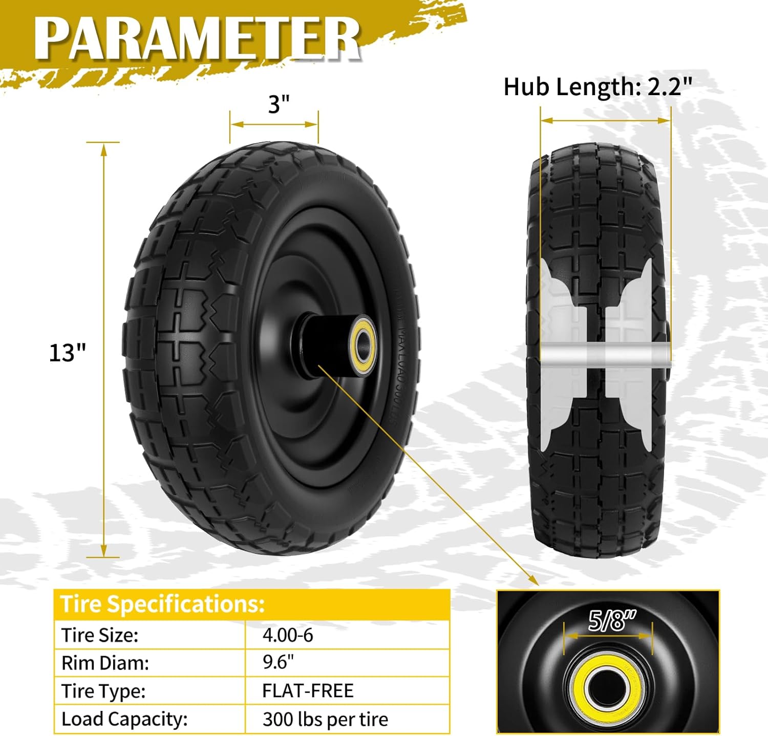 Product Name: 13" Flat Free Solid Tire Wheels Application: The 13" flat free wheel tires are compatible with garden trolleys, manual trucks, flatbed carts, wagon carts, and wheelbarrows, and can be applied to various terrain conditions, including grass, stone roads, dirt roads, snowy roads, sandy roads, and cement roads. Dimensions of the Flat Free Tire and Wheel Color: Black Model: 4.00-6 Tire Model: 13" Flat Free Tire Diameter: 13" Tire Width: 3.2" Axle Bore Hole: 5/8" Offset Hub Length: 2.2" Max Load: 300 LBS Package Includes: 2 x 13" Flat Free Wheel Tires Easy Handling Work - Say Goodbye to Tire Explosion and Inflation Heavy Duty Ball Bearing The replacement tires are designed with double-sealed ball bearings and sturdy steel rings that keep the load balanced and allow the tires to rotate flexibly. The tires can keep a strong grip when they move on the ground. One-Piece Wheels Compared to split wheels, which can weaken at the joint over time, the garden cart wheels are less prone to breaking. With no joints or bolts, the 4.00-6 flat free tires are less likely to become loose or detached, providing a reliable solution. Additional support The liner provides an extra layer of support that helps keep your tires from sharp objects and punctures. It also helps maintain consistent air pressure and distribute weight more evenly, improving traction, stability, and overall tire performance.