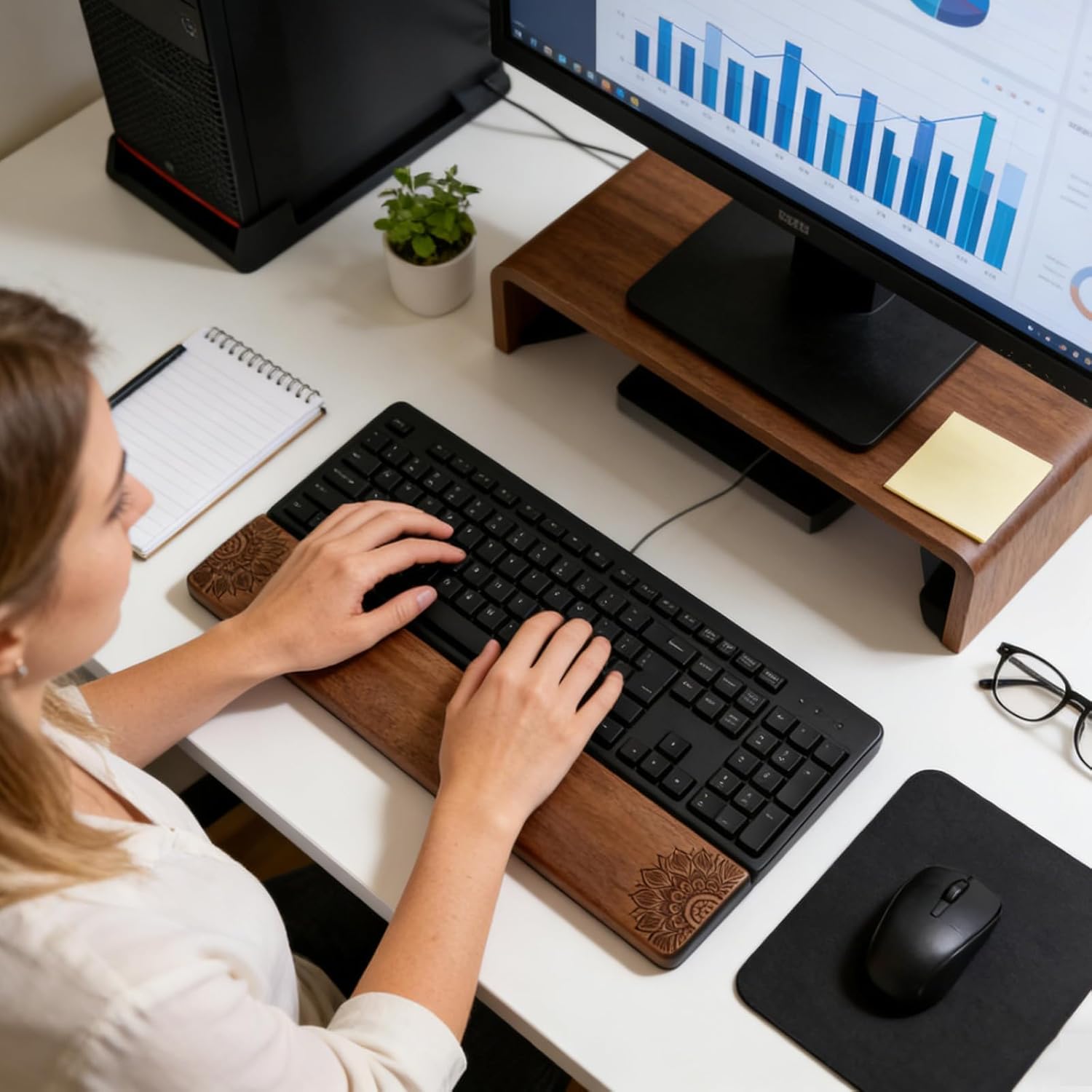 Bring a touch of natural elegance and ergonomic comfort to your workspace.This handcrafted walnut wooden keyboard wrist rest is designed to support your wrists during long hours of typing or gaming. Its smooth, oil-finished surface offers both tactile pleasure and durability, while the curved ergonomic shape helps maintain a neutral wrist posture — preventing strain and improving overall comfort.Whether you’re a programmer, writer, designer, or gamer, this walnut wrist rest is a minimalist yet functional upgrade that makes your desk look as good as it feels. This 14.2×3.2×0.8in premium walnut wooden keyboard wrist rest is expertly handcrafted to complement 65%–75% / 87-key (TKL) mechanical keyboards as well as 15–16 inch laptops. Each wrist rest comes with two self-adhesive anti-slip rubber pads, which are not pre-attached to the walnut wrist rest. You can freely decide whether to apply them and choose the exact position based on your desk surface — giving you full control over stability and preventing any unwanted sliding during use. Warm tips:Not recommended for ultra-thin laptops under 15mm due to height mismatch. Best suited for elevated or mechanical-style keyboards and standard-height laptops. Cleaning & Maintenance Guide: Daily Cleaning: After use, gently wipe the surface with a soft cloth to remove dust and sweat. This prevents stains from affecting the wood's natural shine. Monthly Care: Every 1-2 months, apply a small amount of wood wax oil evenly across the surface. This nourishes the wood to prevent drying and cracks, while ensuring the beautiful grain and smooth feel of the walnut wood last for years to come.