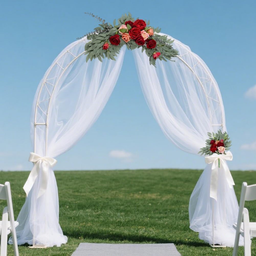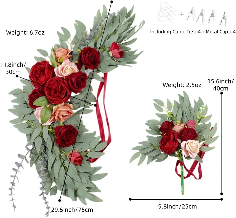 This artificial flower kit can be either used for welcome sign, wedding chair and outdoor archway for wedding ceremony, or indoor centerpieces and table arrangements.Various colors: Various colors are available. There is always one to match with your wedding style.Size: The larger flower swag is 29.5" long x11.8" wide, and smaller flower is 15.6" long x 9.8" wide. Straightening measurement.Packing: Floral Swag x 2 + Cable Tie x 4 + Metal Clip x 4 (Not include wooden sign & stand).Warm Tips: Silk flowers are made of fabric, might be squeezed a little bit during shipping. Please sort the petals buds to help recover the shape.