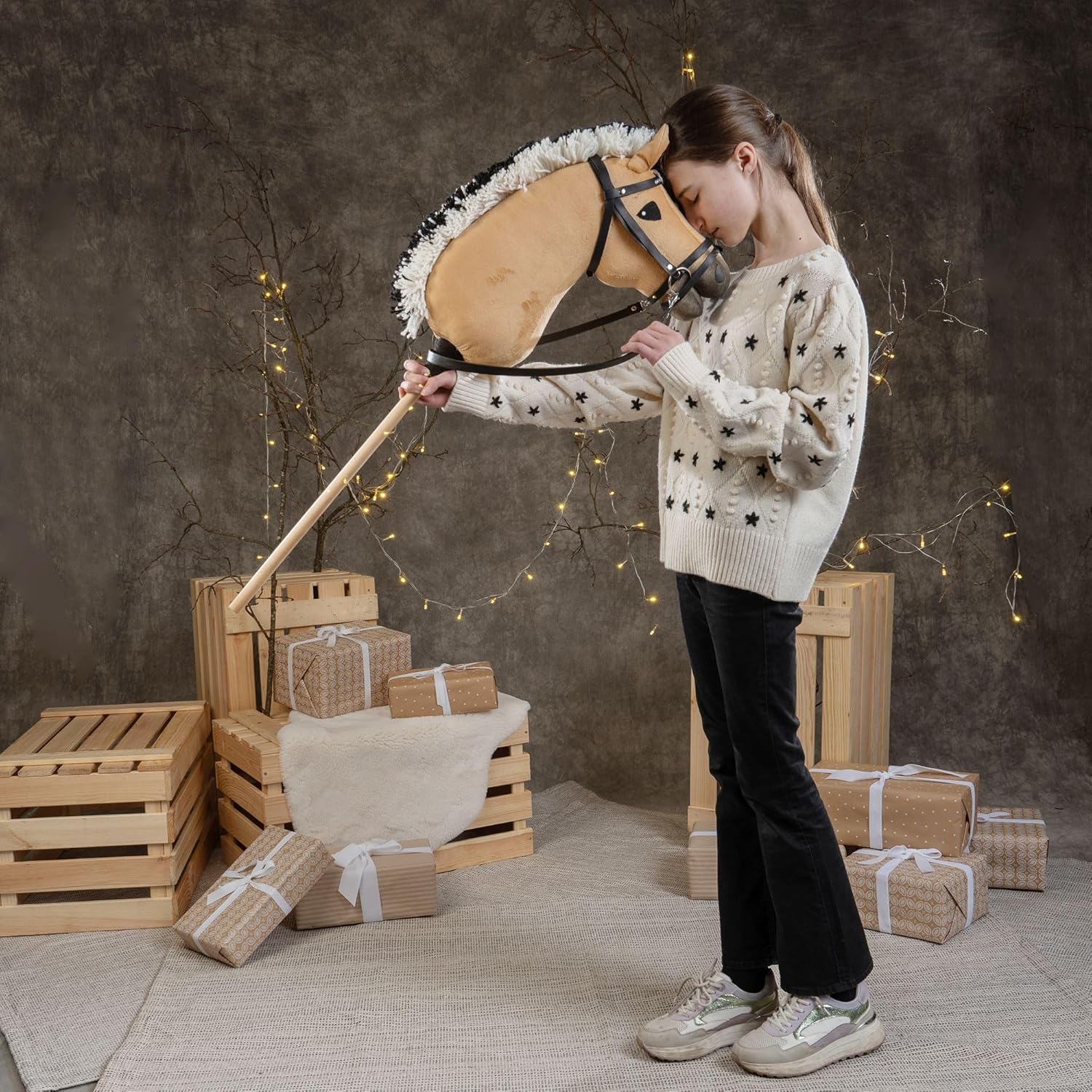 Fully handmade hobbyhorse, made of plush fabrics, sturdy filled by synthetic winterizer. Tack is made of genuine leather. Head mounted on wooden birch stick, oiled with linseed oil. Dimensions of head (approx.) 17x10x4.5 inches. Stick length - 19.6 in (by default) or 13.8 in. Approx. weight - 2.2 lbs. Proudly, handmade by our family since 2012.