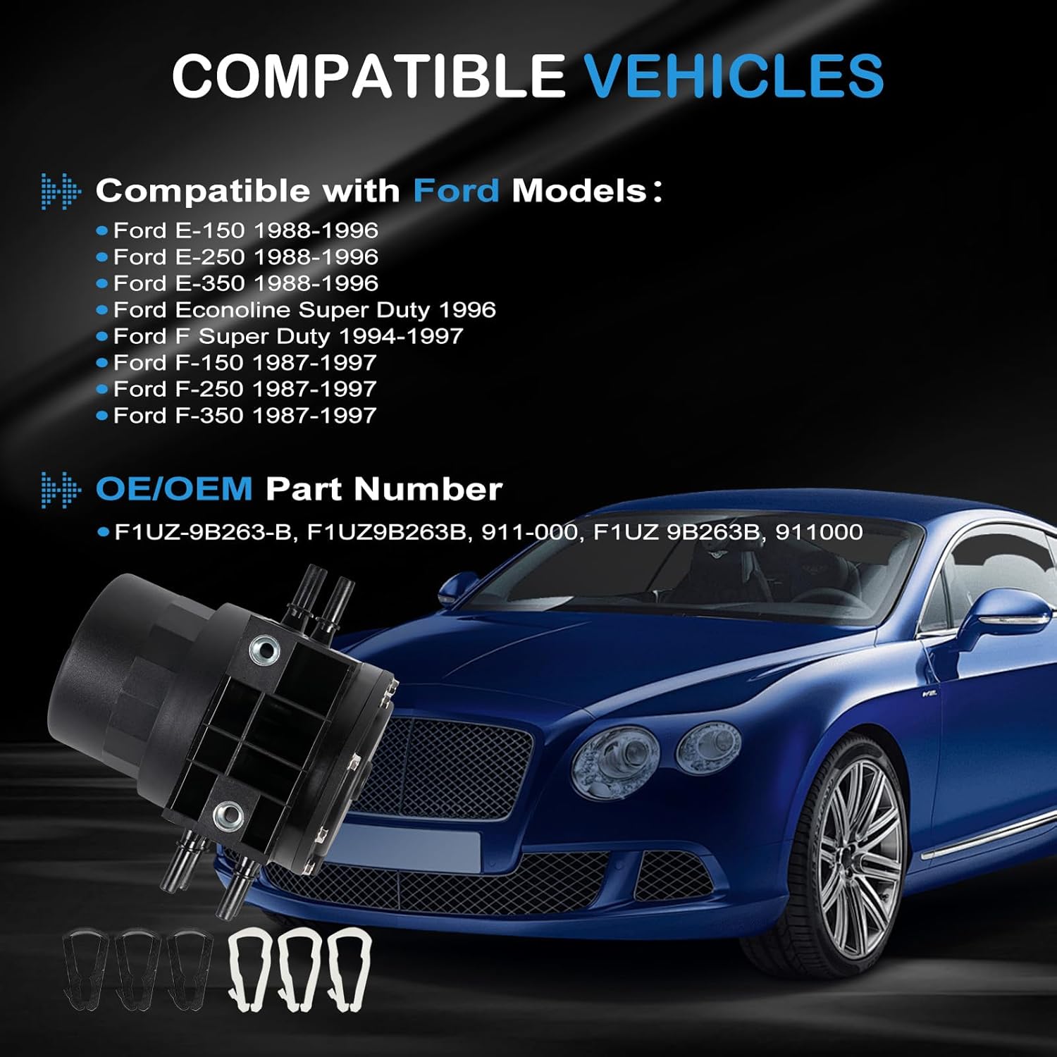Features:● Made of premium material for maximum durability.● Professional manufacturing, exquisite workmanship, high reliability.● Easy to install, perfect match to the original car.● A good replacement for the old or broken one.Specification:Type Name: Fuel Tank Reservoir Selector Valve AssemblyCondition: Brand New and High QualityPart Number: F1UZ-9B263-B F1UZ9B263B 911-000 F1UZ 9B263B 911000Fitment Type: Direct ReplacementPlacement on Vehicle: FrontVehicle Fitment:Compatible with 1987-1997 Ford F150 F250 F350Compatible with 1988-1996 Ford E-150 E-250 E-350Compatible with 1996 Ford Econoline Super DutyCompatible with 1994-1997 Ford F Super DutyPackage Includes:1x Fuel Pump Reservoir Tank Selector Valve▶Notice:1. Please confirm your Vehicle Identification Number with our part number or interchange part number before ordering.2. Please make sure that the model number, and photo are the same as yours before ordering.3. If not sure, please send me some pictures of your original item & VIN number before ordering.4. We recommend professional installation when you are not familiar with it. Be careful when installing and testing, otherwise, it will cause damage to the parts.5. Communication is the best way to solve the problem. If you have any problems after purchasing, please contact us in time, before opening return or case.▶Excellent After-Sales Service:Kessocco has a professional technical team, that not only offer top-notch products but also provide outstanding after-sales service. Customer satisfaction is of utmost importance to us. Our professional team is available to support you after your purchase, assisting with any inquiries and providing technical guidance