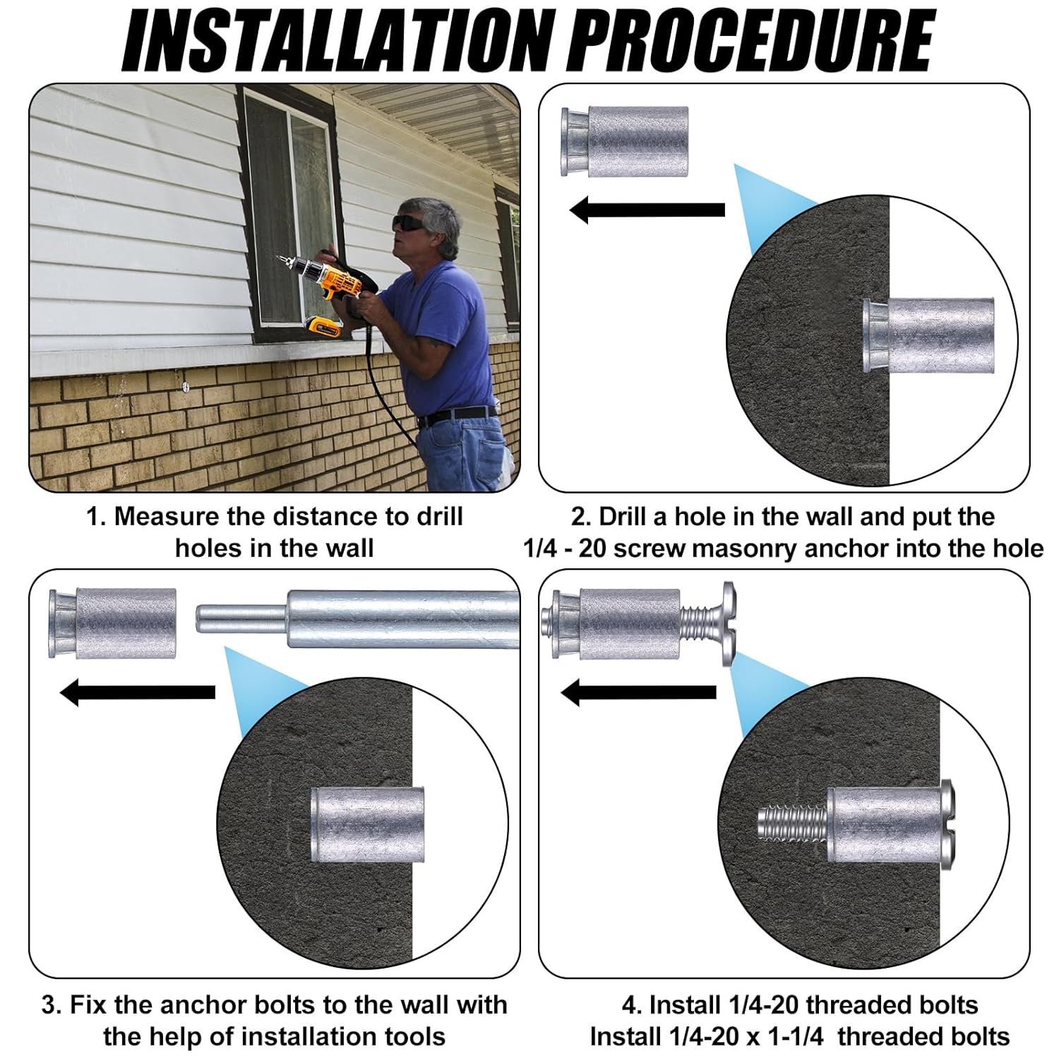 Features: Ideal for a variety of applications, usually applied to attach storm windows and shutters to brick or masonry walls. Equip your outdoor installations with our reliable and robust bolts, ensuring that they stay put, even in the harshest weather. Enjoy peace of mind as our bolts offer reliable and efficient functionality for a wide range of applications. Please note, it's essential to consult if you're uncertain about the installation process. Specifications: Material: 18-8 stainless steel Color: Size: 1/4-20 x 1-1/4 inch hurricane sidewalk bolt 1/4-20 x 1-1/4 inch steel bolt 4.02 inches erecting tools for bolt Package includes: 48 x Hurricane sidewalk bolt 48 x Hardware stainless steel bolt 2 x Erecting tools for bolt Notes: Manual measurement, please allow slight errors on size. The color may exist a slight difference due to different screen displays. Pointed items are included, please be careful when using and please keep them away from kids.