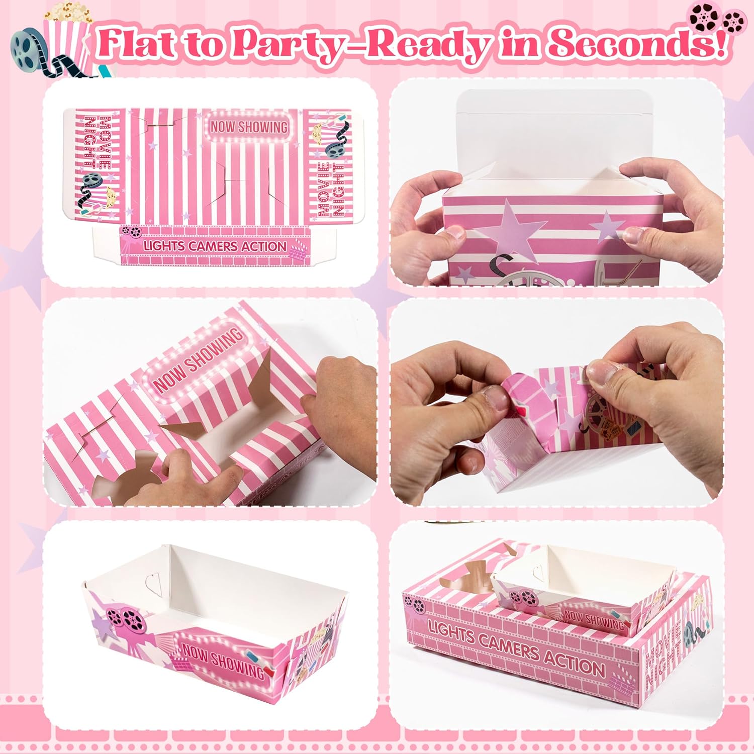 | Included Components | 12 Food Trays, 12 Popcorn Bags, 24 Snack Boxes |