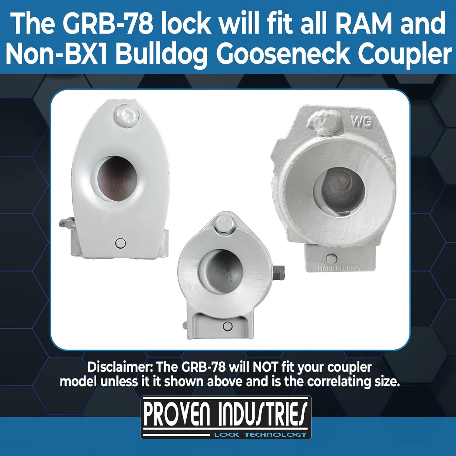 Without high-quality locks, you can’t protect your utility trailers and personal possessions. Our Model GRB-78 Trailer Lock is a safe, powerful lock designed to help you increase the security of your trailers. It’s constructed with hardened steel that protects against bolt cutters, saws, and other power tools and features a unique key design that prevents someone from creating a copy of your key. Help protect your possessions and work equipment with our incredible heavy-duty coupler lock.This custom-tailored trailer and RV lock is designed to fit only specific Ram or BullDog gooseneck trailer couplers. Our secure trailer lock is easy to install and is made of 3 lock components: an inner slide, an exterior shield, and a puck lock. To use, attach the inner slide to your coupler and engage the latch. Place the exterior shield over the coupler and line up the 2 slide tabs. Then, place the puck lock over the tabs. Add this lock to your camper and travel-trailer accessories for durable protection of your belongings.Proven Industries is a family-owned business dedicated to helping you safeguard your trailers from theft and damage. We manufacture our locks in the USA with care and attention to every detail. You can rely on our high-quality locking products.