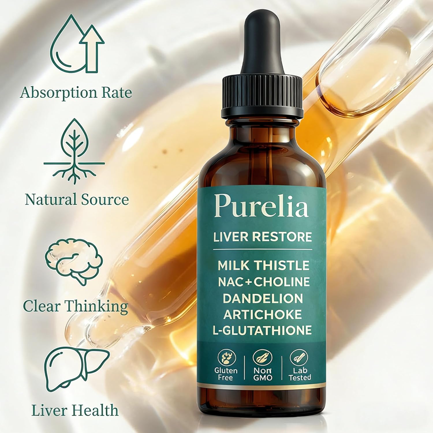 Purelia Liver Restore Drops – with Milk Thistle, Dandelion, Glutathione, Artichoke, Turmeric, & Astragalus | Non-GMO, Gluten Free