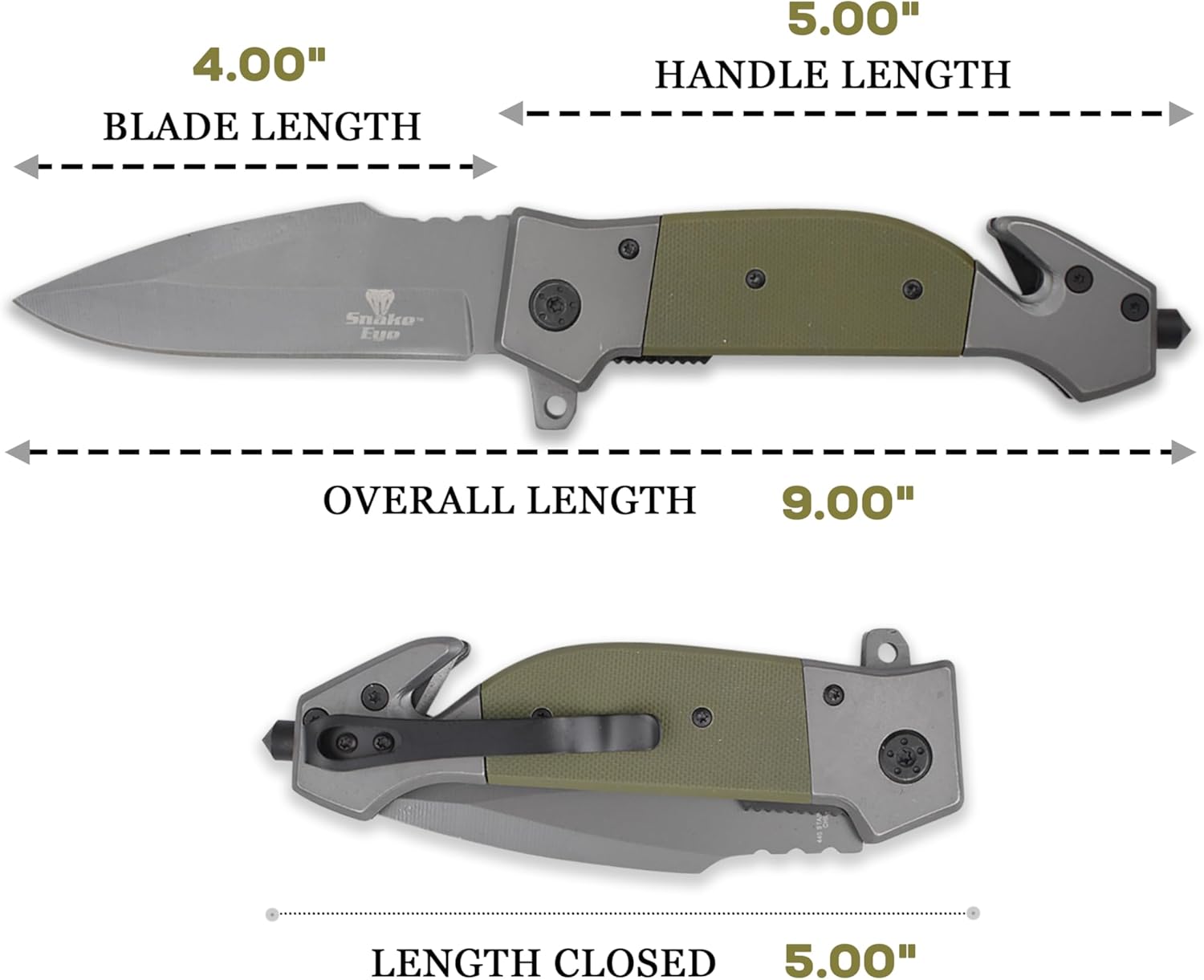 Snake Eye Tactical Heavy Duty Rescue Style Folding Pocket Knife. 9-Inches Overall length of knife when opened. 4-Inches 440 Stainless Steel Grey Finish Blade. 5-Inches Green G10 & Metal Heavy Handle With Seat Belt Cutter & Glass breaker. Pocket Clip Also Included.